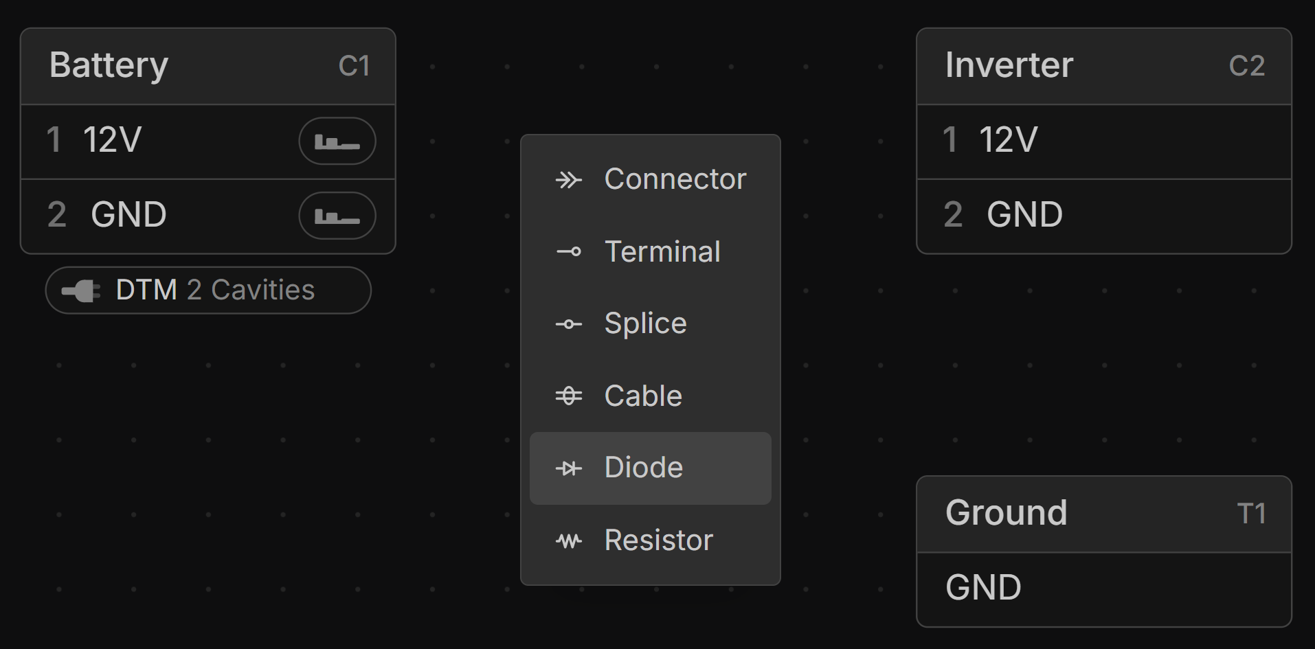 A Diode is an electrical component that allows current to flow in only one direction. Each diode can be assigned a diode part.