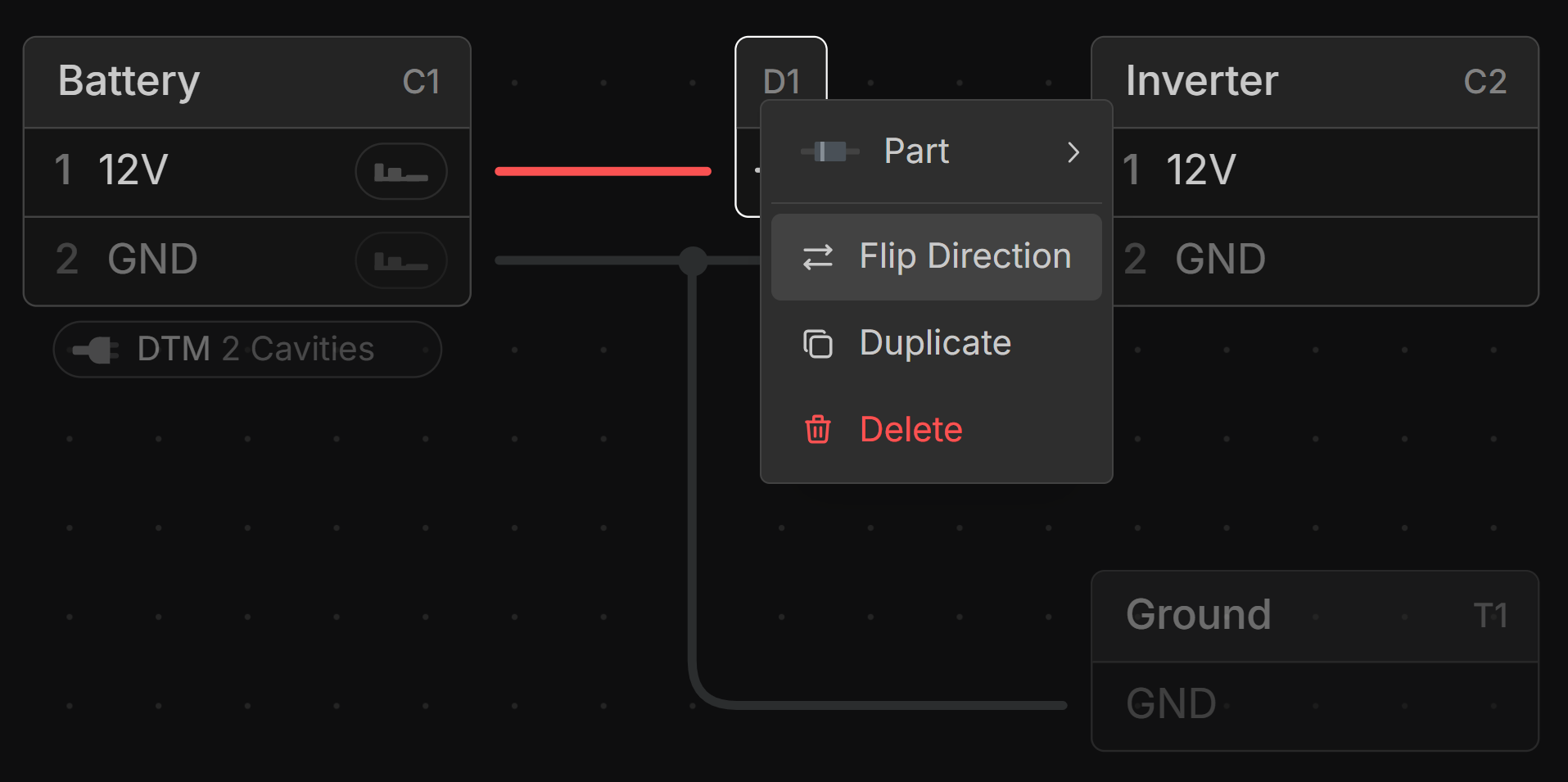 right-click a diode in the Schematic or Layout View and select Flip direction to reverse its orientation.