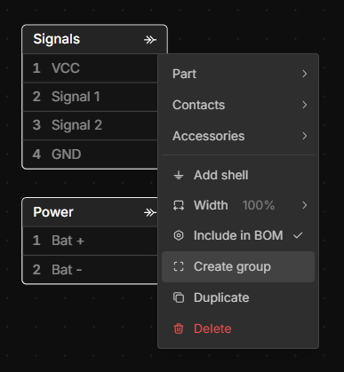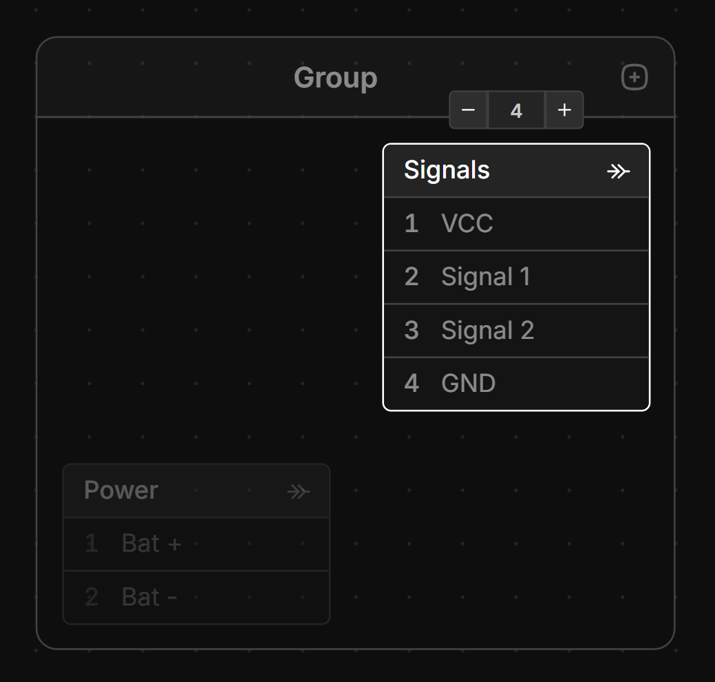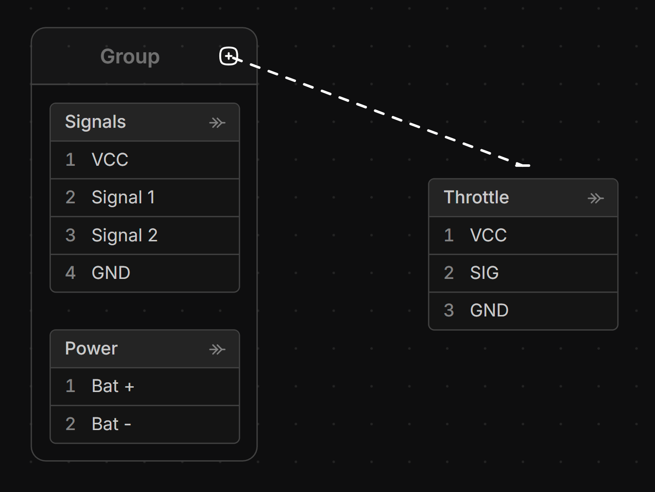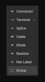 A group contains a selection of components. It is commonly used to represent a device (i.e. an ECU, fuse box etc). A group can be assigned a Device Part.