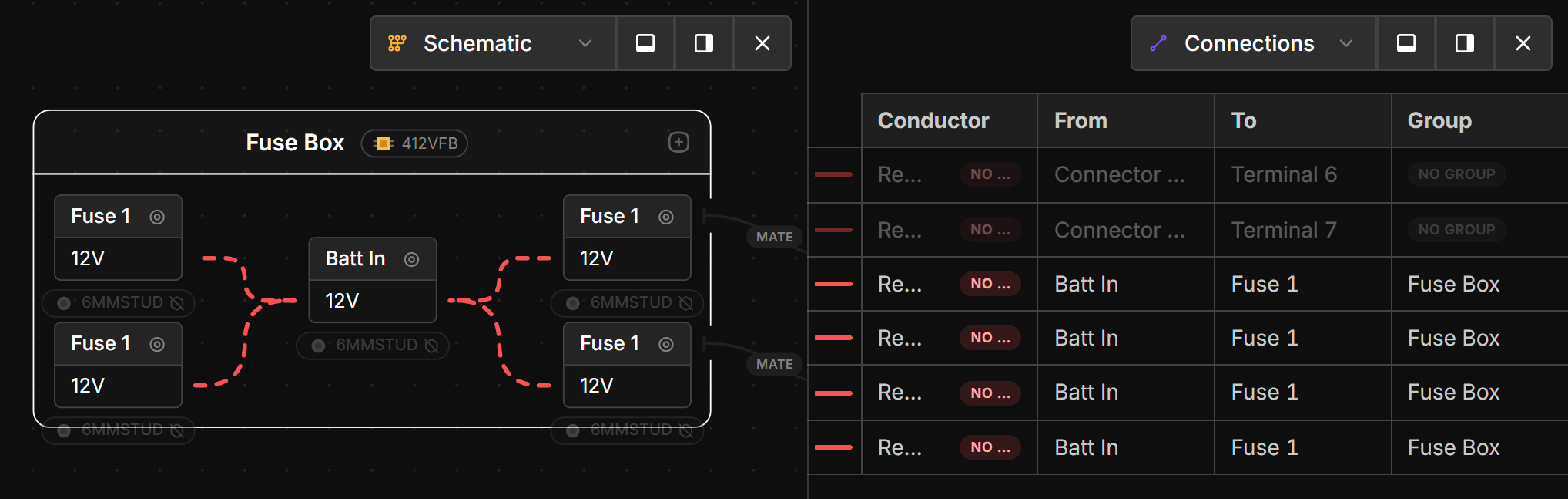 If there are wires between two components in the same group, the wire will be considered part of the group. This information will be displayed on the Connections View and the Wiring Table export