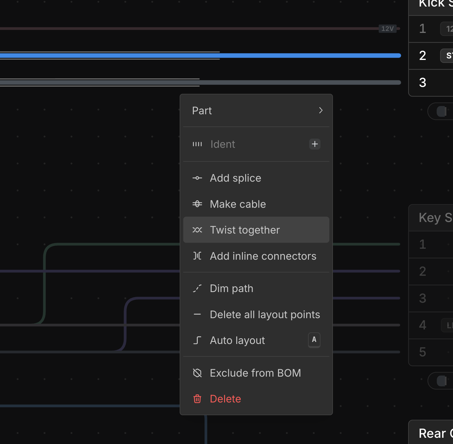 Select multiple wires, right-click, and choose Twist together. This creates a twisted wire group with the selected wires.