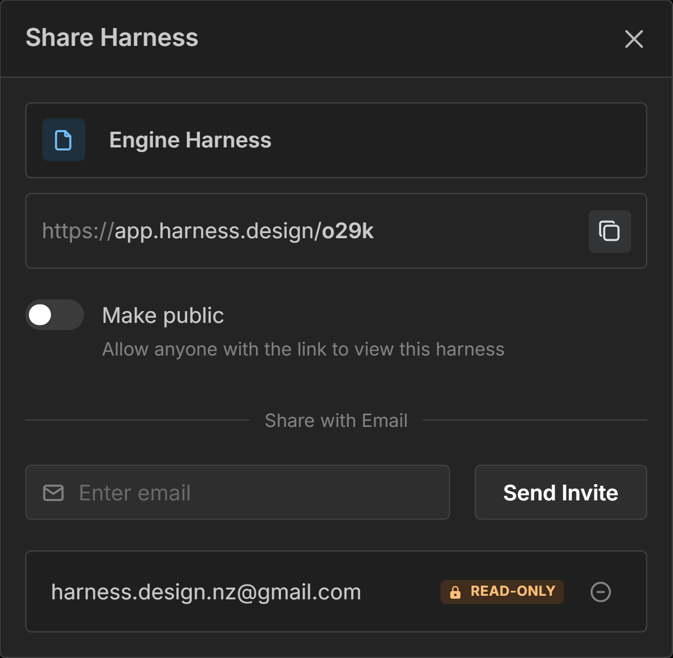 If the harness is not public, only users shared via email will be able to open this link. Click the copy button to copy the link to your clipboard.
