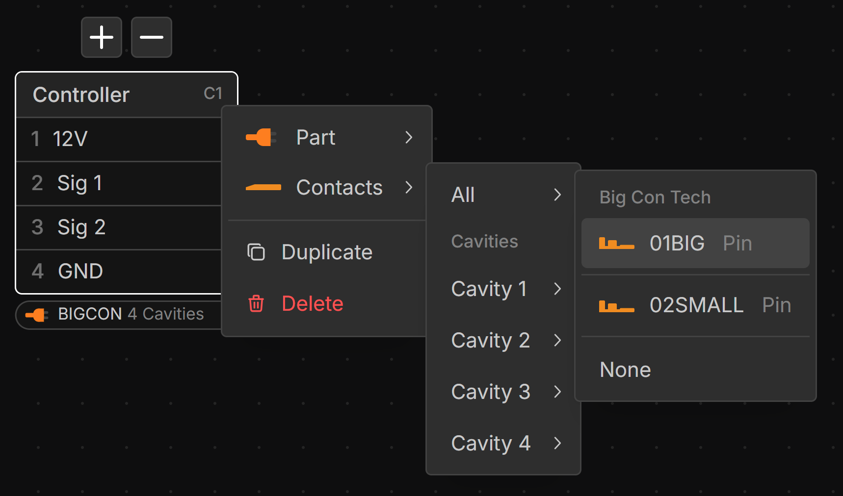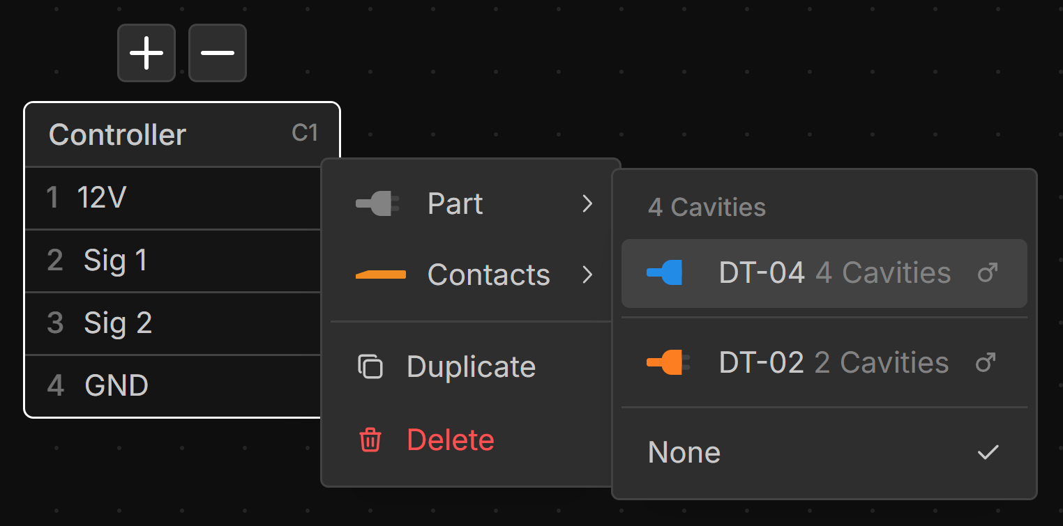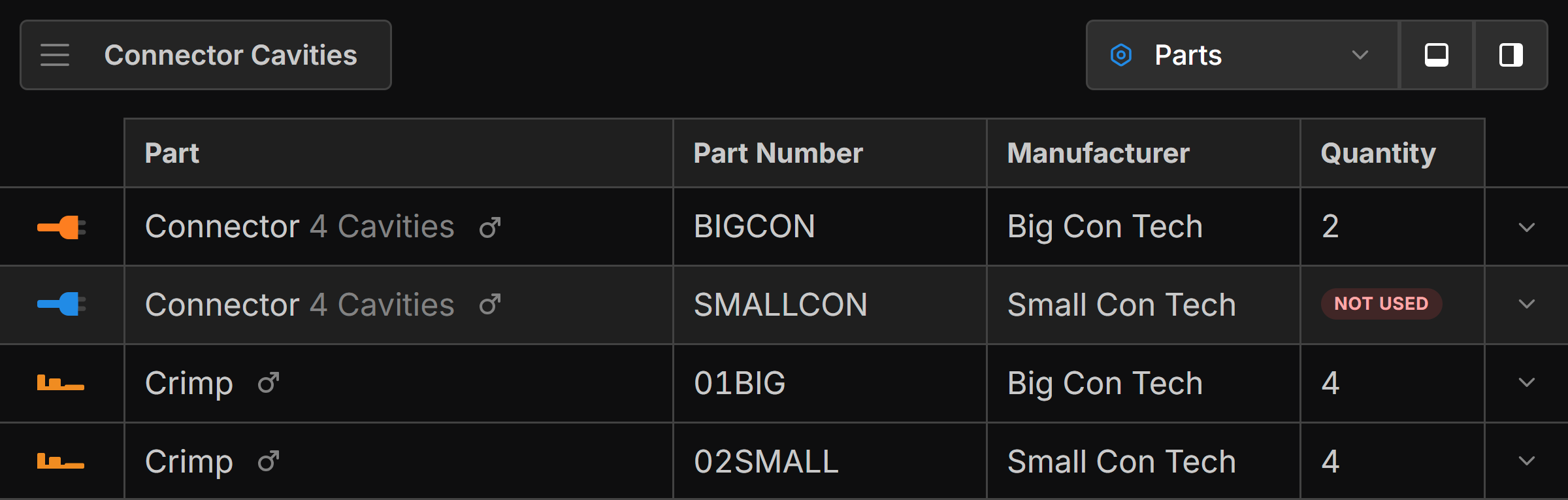 Parts with the same cavity count are suggested at the top of the parts list when assigning a part to a connector.