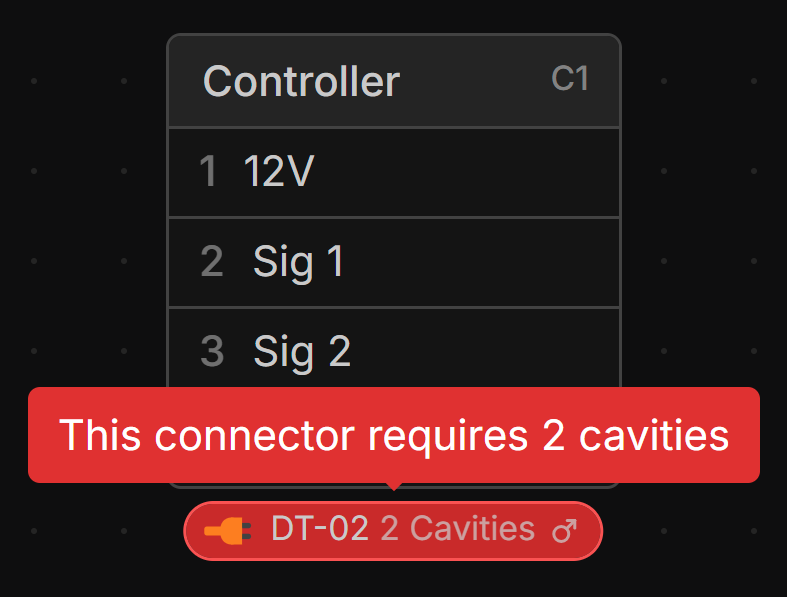 If the Connector and Connector Part do not match the number of cavities, a warning is shown in the Schematic view.