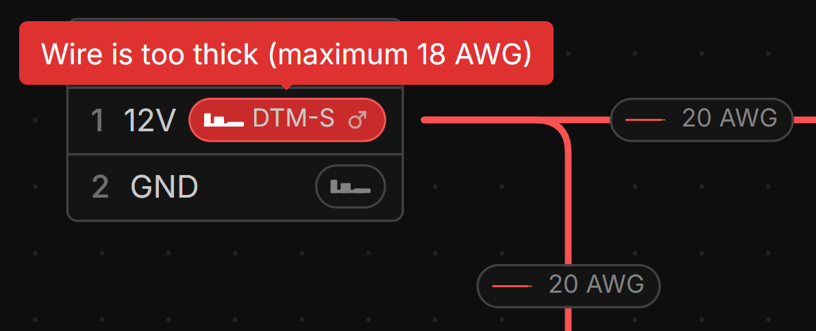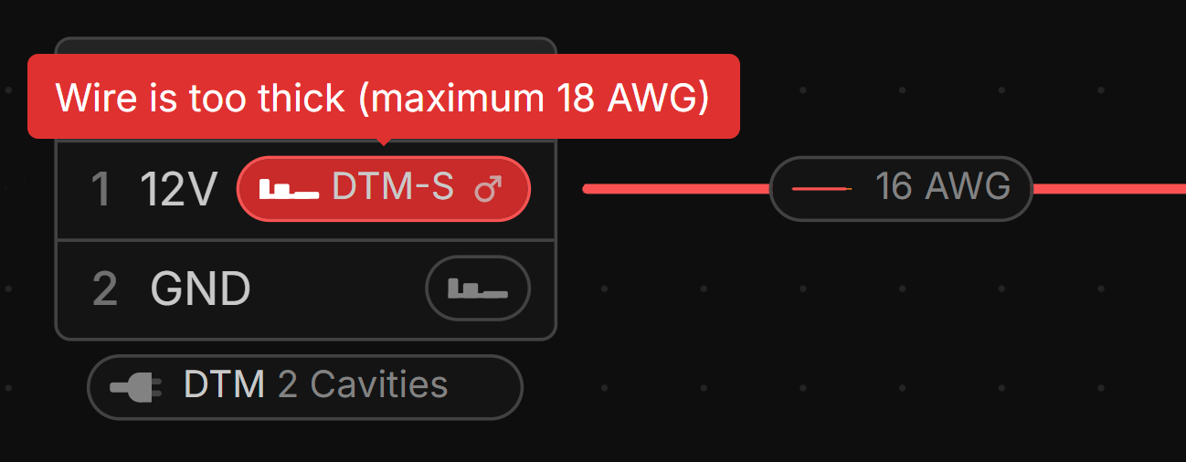 If the Wire gauge does not match the properties of the Contact, a warning is shown in the Schematic view.