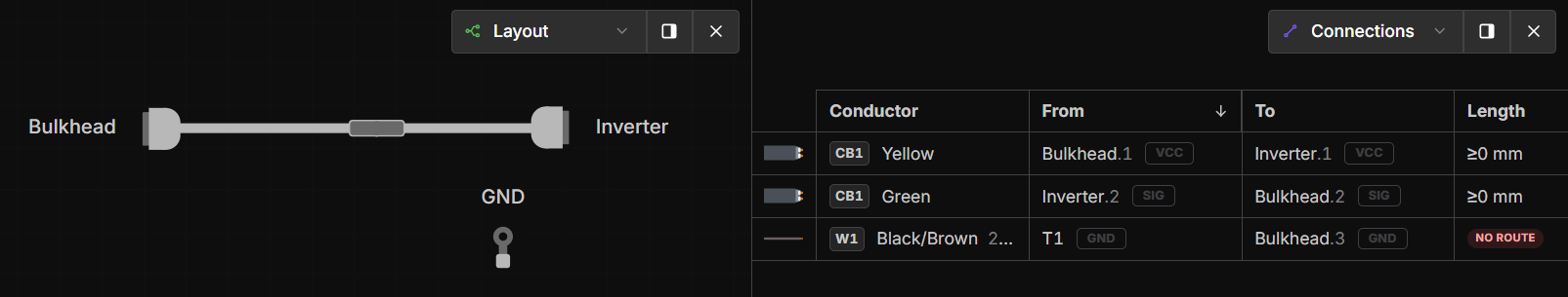 Wires that cannot be routed through Bundles will show a NO ROUTE warning on the Connection screen.