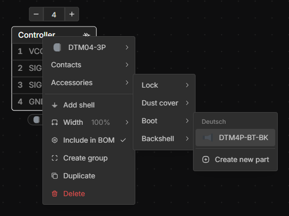 right-click on a connector in the Schematic or Layout View, click Accessories → Boot, and select the boot part you want to assign.