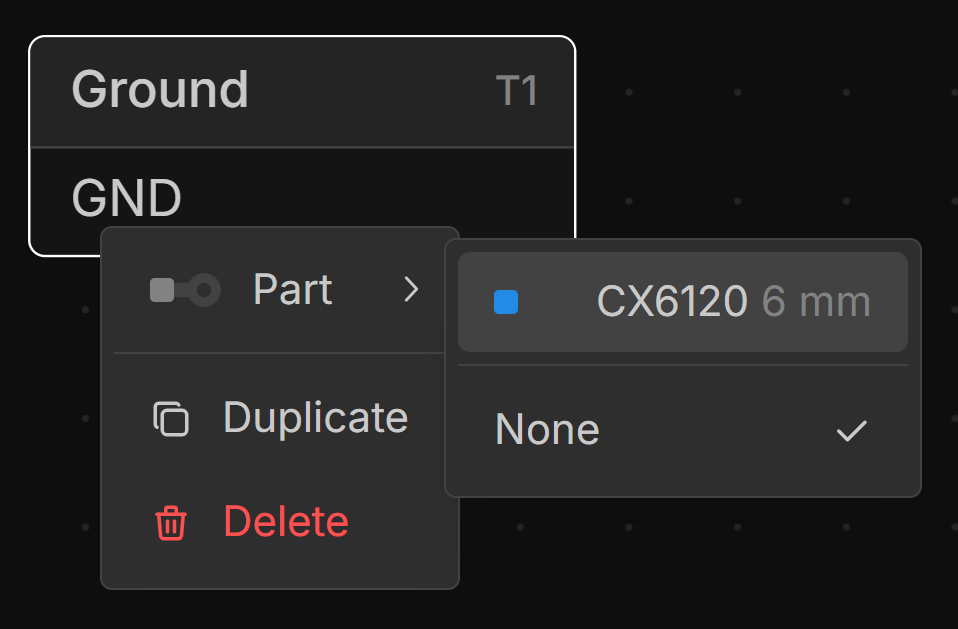 Right-click a terminal in the Schematic or Layout View and select the desired Terminal Part to assign.