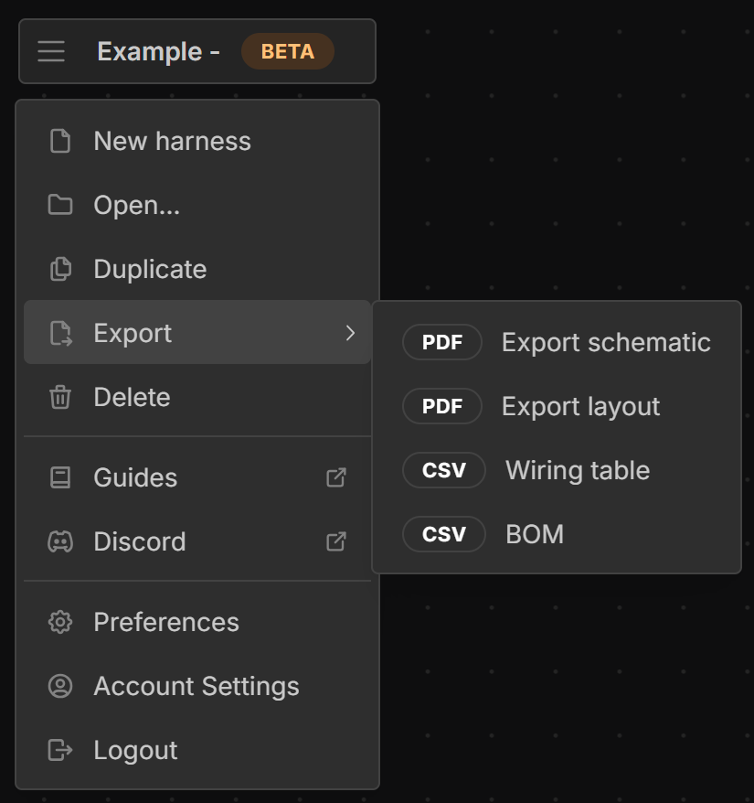 Go to Main Menu → Export and select Schematic, Layout, Wiring Table or BOM.