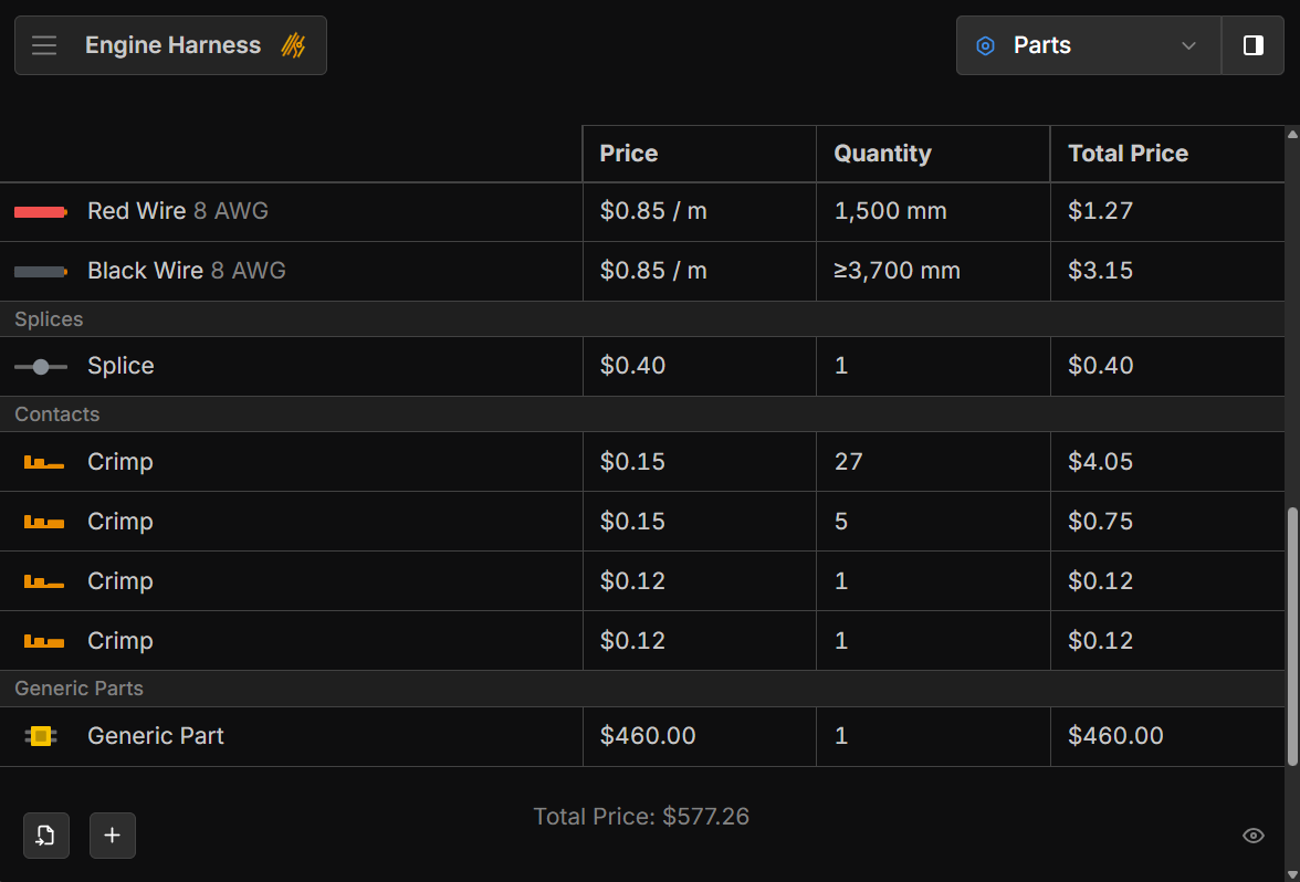 Parts can now have a price assigned. For parts sold by length, a per-unit price can be set. The Unit Price and Total Price columns in the Parts View show the cost per part and the total cost across the harness.