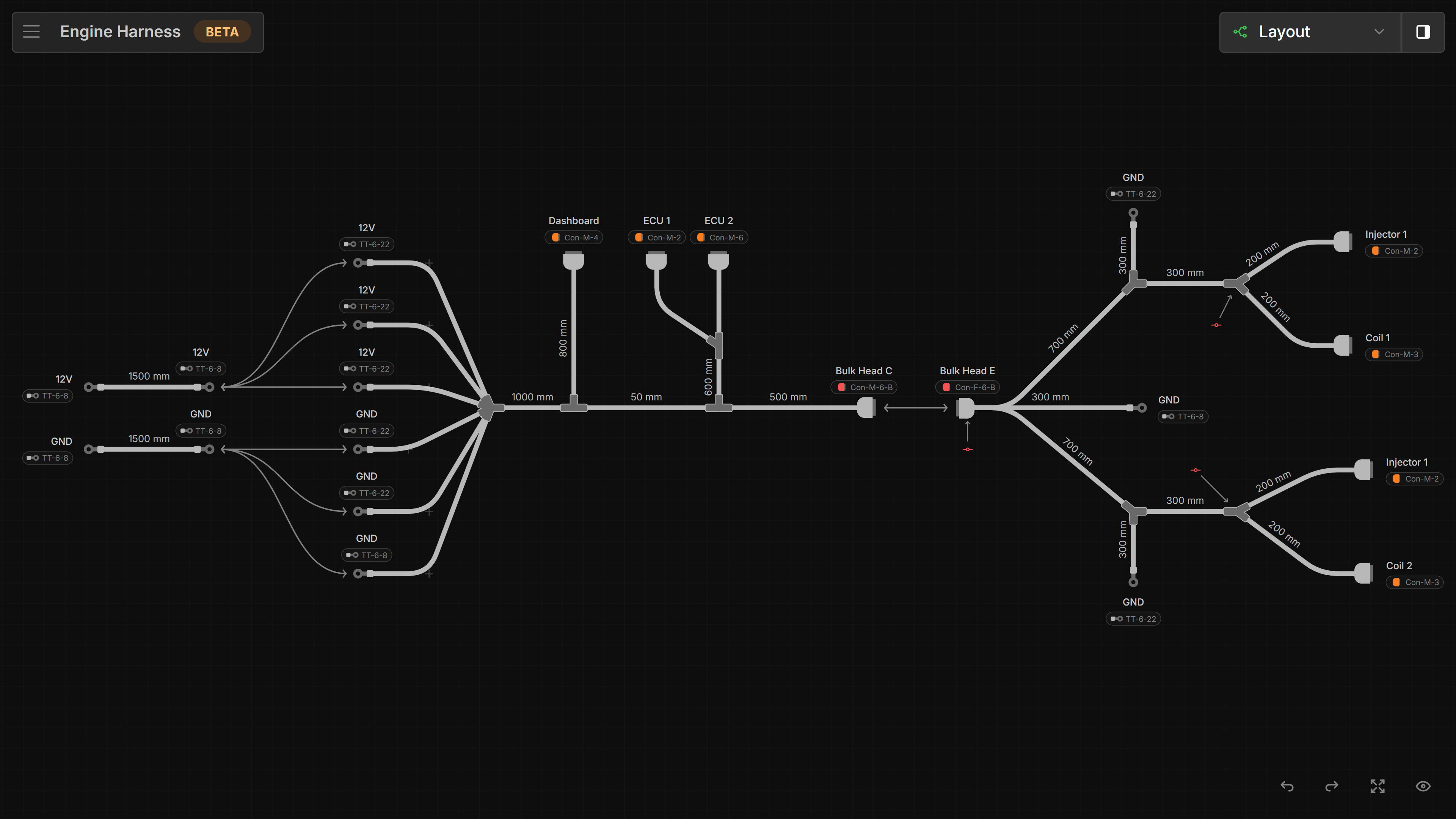 The Layout view is a visual representation of the physical layout of the harness. In this view you can add Connector, Terminal and Branch Point Components and connect them together with Bundles. You can then assign specific Parts to each component such as Coverings.