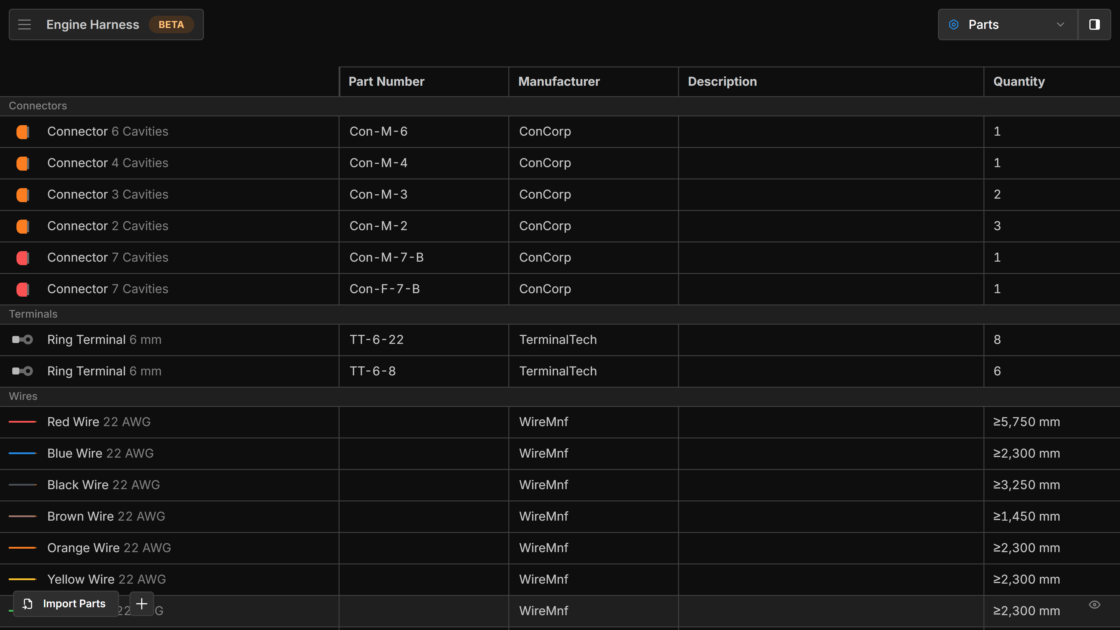 The Parts view is a visual representation of the Part used in the harness. In this view you can add Parts, modify their properties and see the how many times they are used in the harness. This is used to generate the BOM.