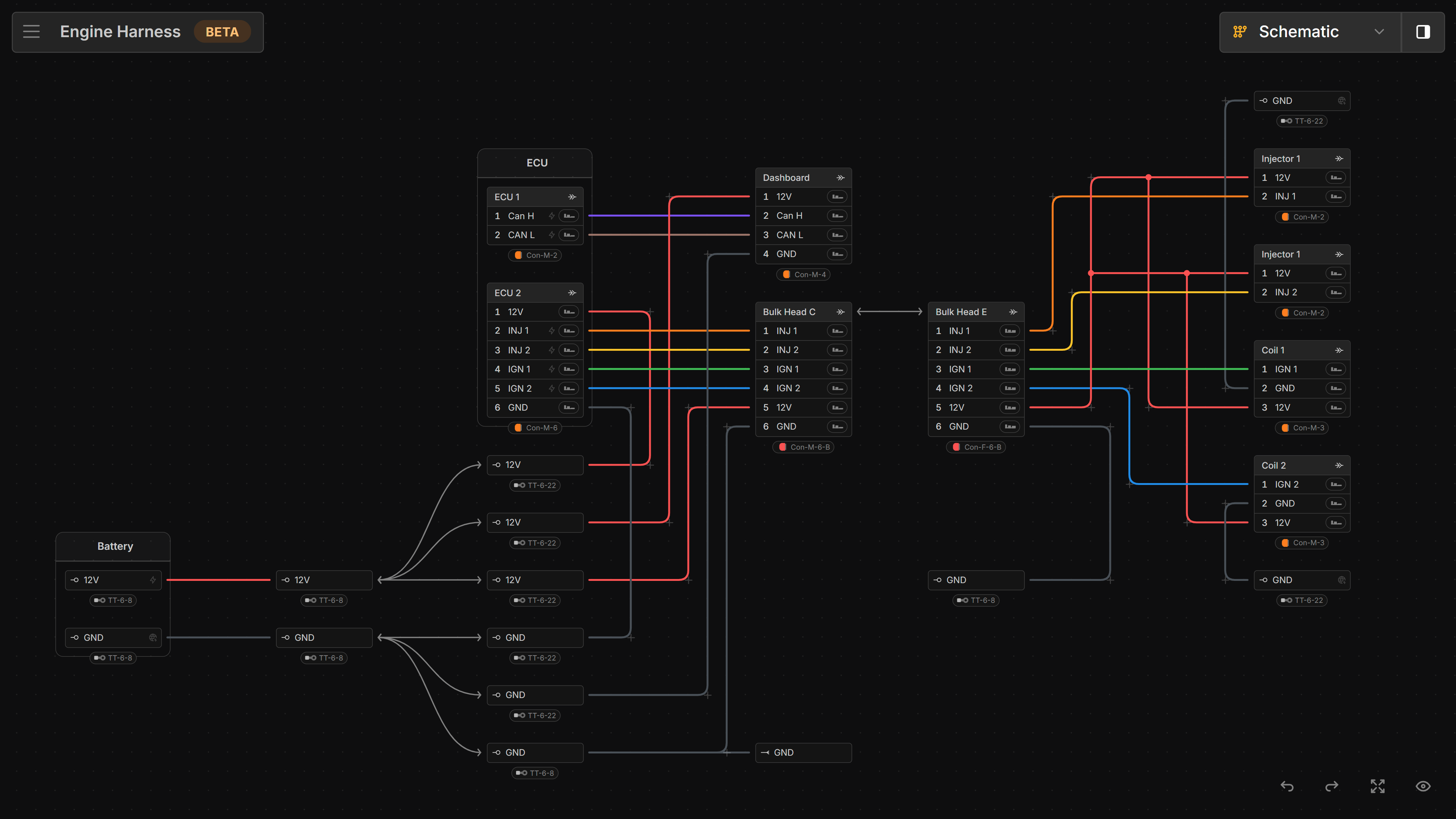 The Schematic view is a visual representation of all the electrical connections in your harness. In this view you can add Connector, Terminal, Splice, Diode, and Resistor Components and connect them together with Wires, Twisted Wires or Cables. You can then assign specific Parts to each component.